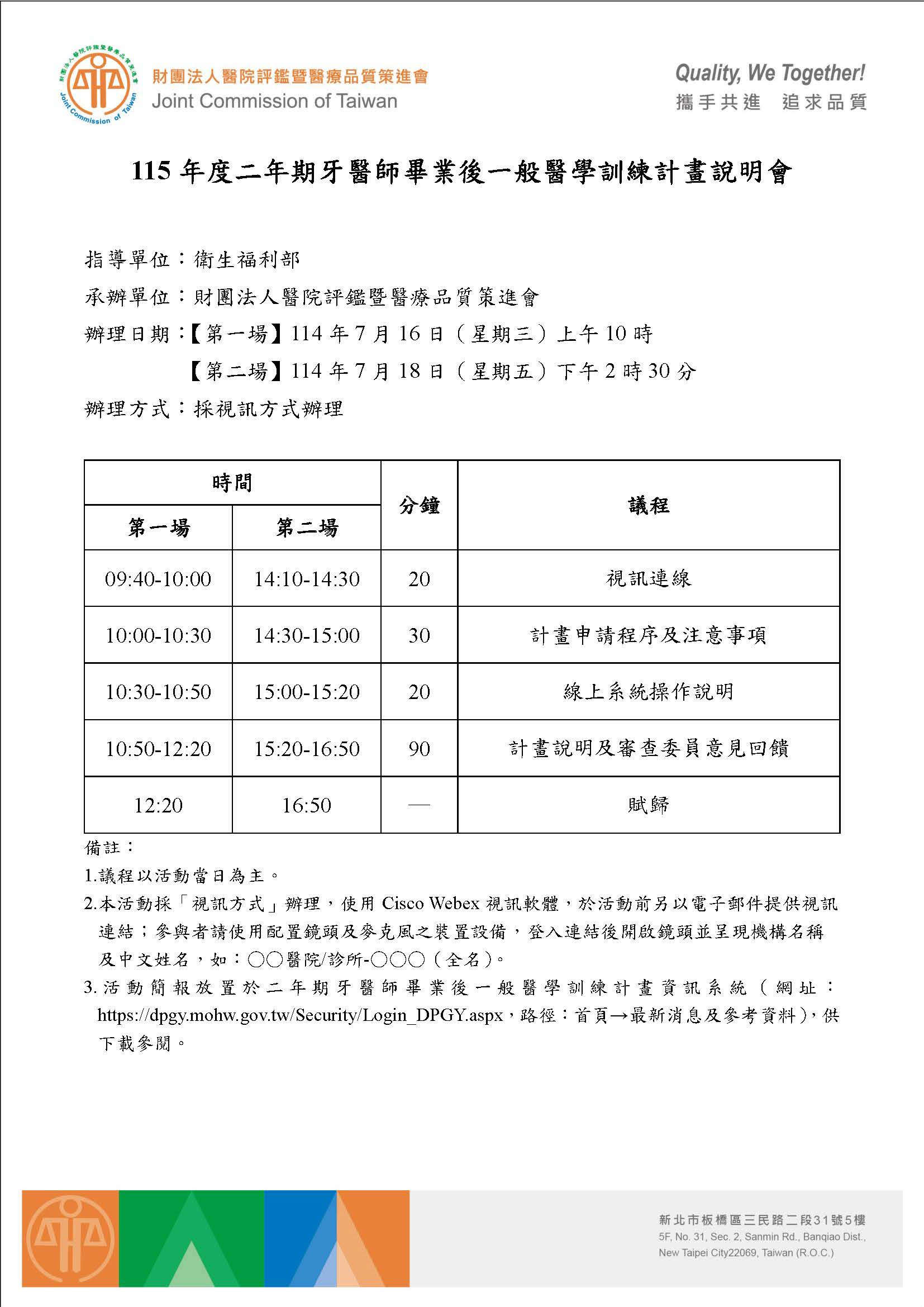 檢附財團法人醫院評鑑暨醫療品質策進會訂於114年7月16日及7月18日辦理「115年度二年度牙醫師業後一般醫學訓練計畫說明會」,請卓參。另檢附衛生福利部公告徵求115年度「二年期牙醫師畢業後一般醫學訓練計畫」,詳附件,請卓參。