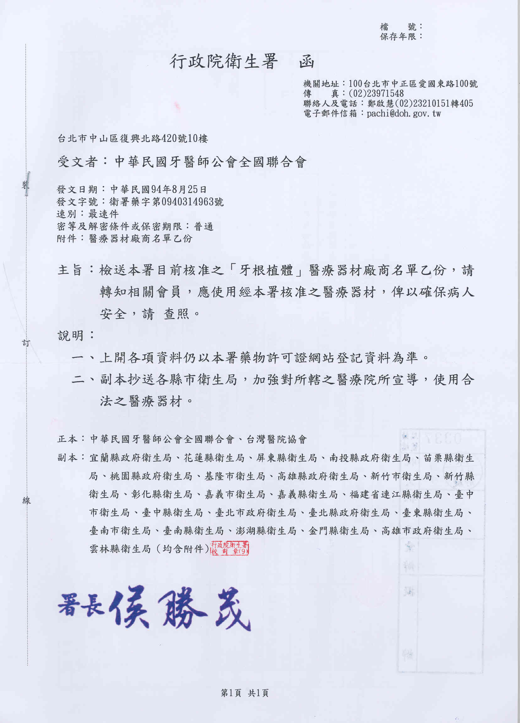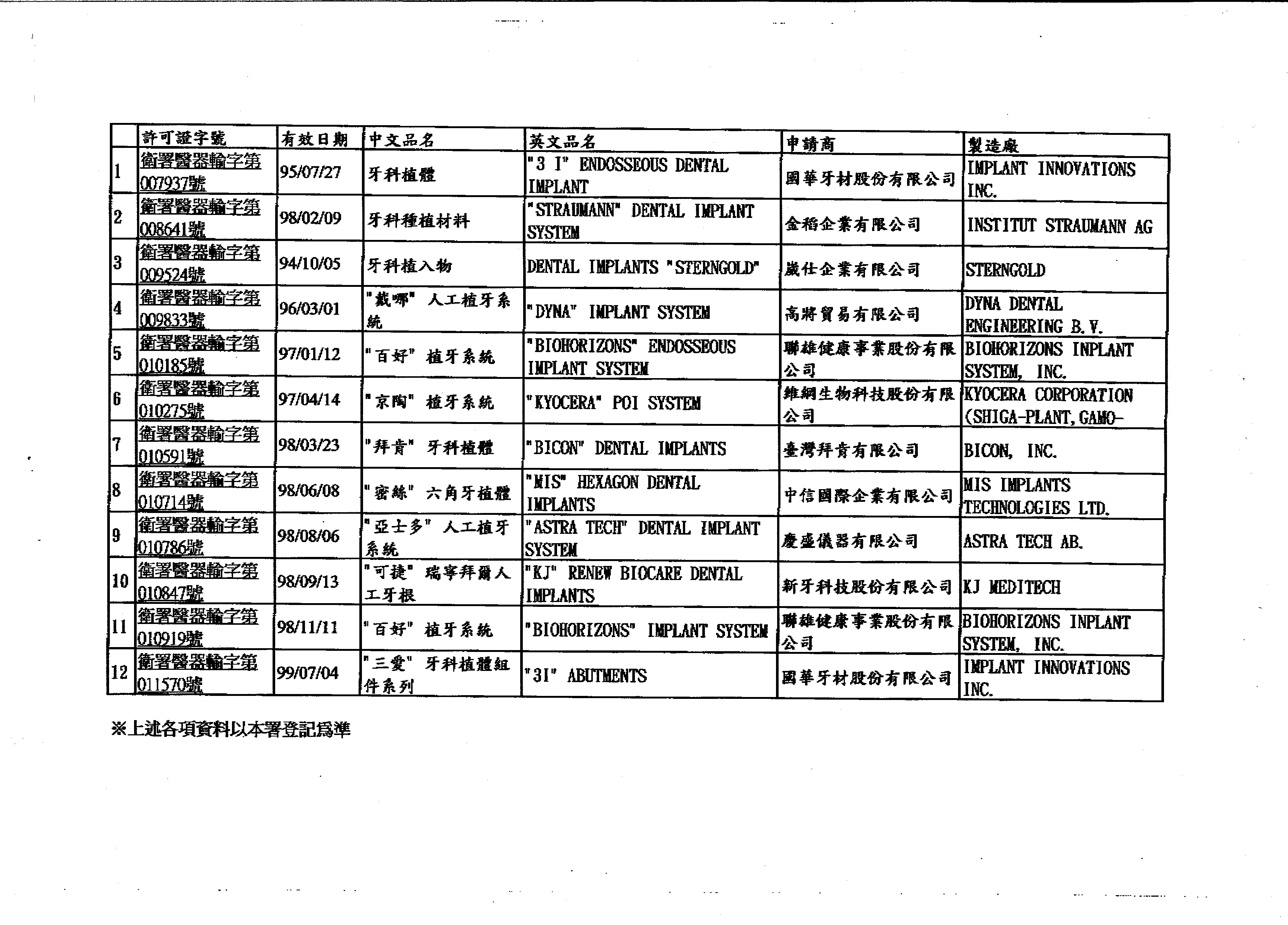 衛生署核准之"牙根植體"醫療器材廠商名單