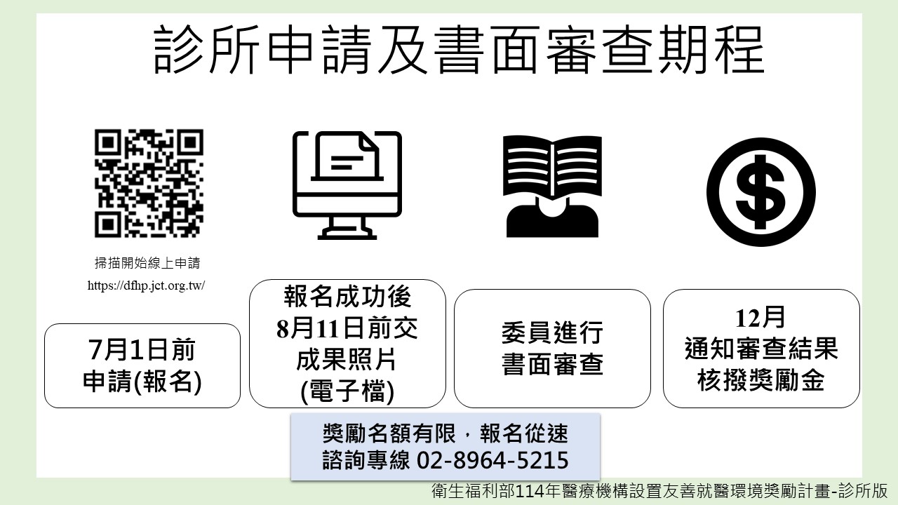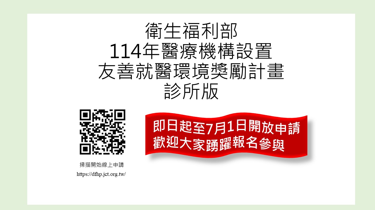 114年7月1日為申請「醫療機構設置友善就醫環境獎勵計畫申請(報名)」最後一日,「診所獎勵計畫說明會」影片連結以及「114年診所版友善就醫環境獎勵計畫懶人包圖片」(如附加檔案),歡迎尚未加入的診所儘早作業,診所獎勵計畫說明會,課程影片連結如下: