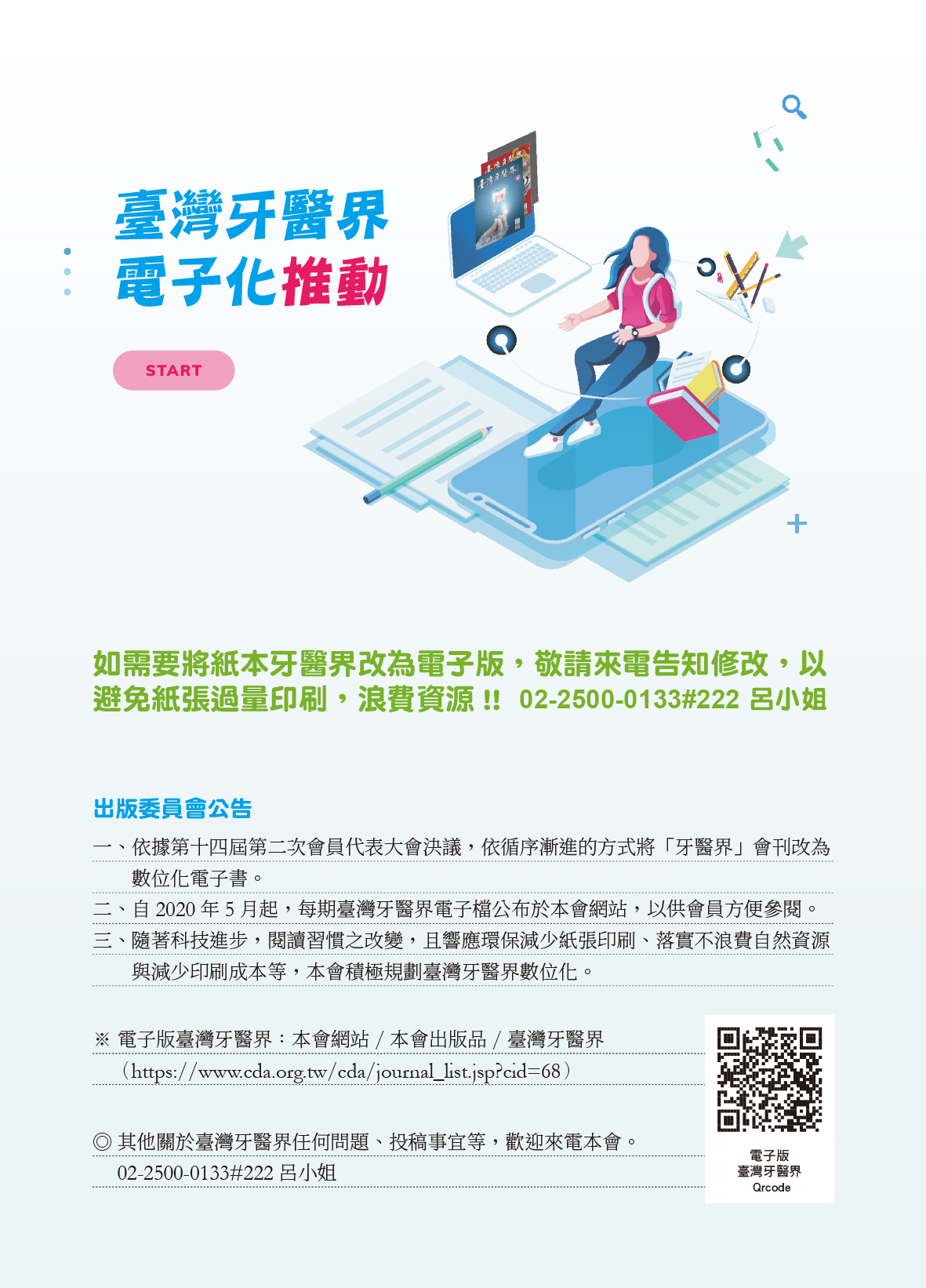 如想將紙本牙醫界改為電子版,請來電告知修改(02-2500-0133#222 呂小姐)或填寫google表單。