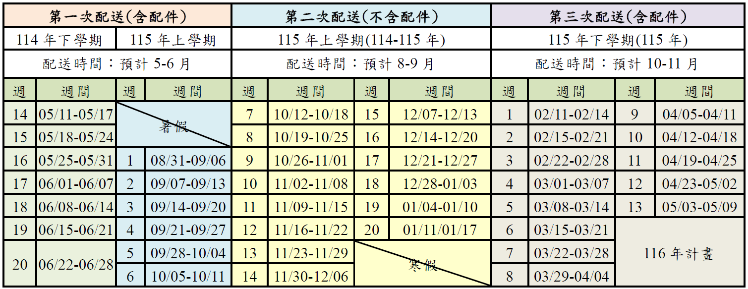 - 115年第一次漱口水配送約4月-5月,第二次漱口水配送約8月-9月,第三次漱口水配送約10月-11月,使用週數規劃表如下圖,敬請各校按照下圖週數規劃表使用。