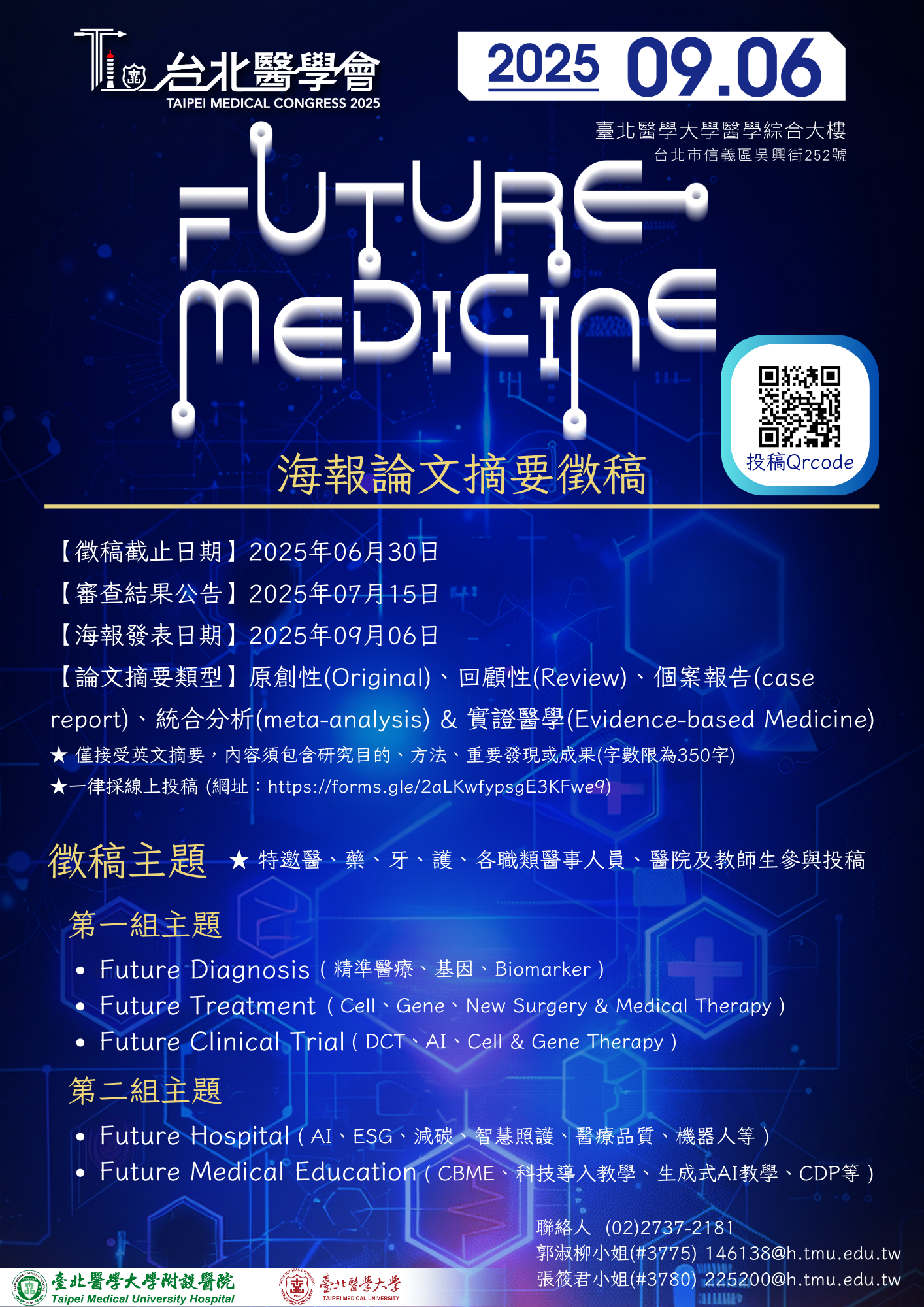 轉臺北醫學大學附設醫院訂於20250906(六)舉辦「2025台北醫學會研討會」,鼓勵踴躍投稿,詳如附件,請卓參。