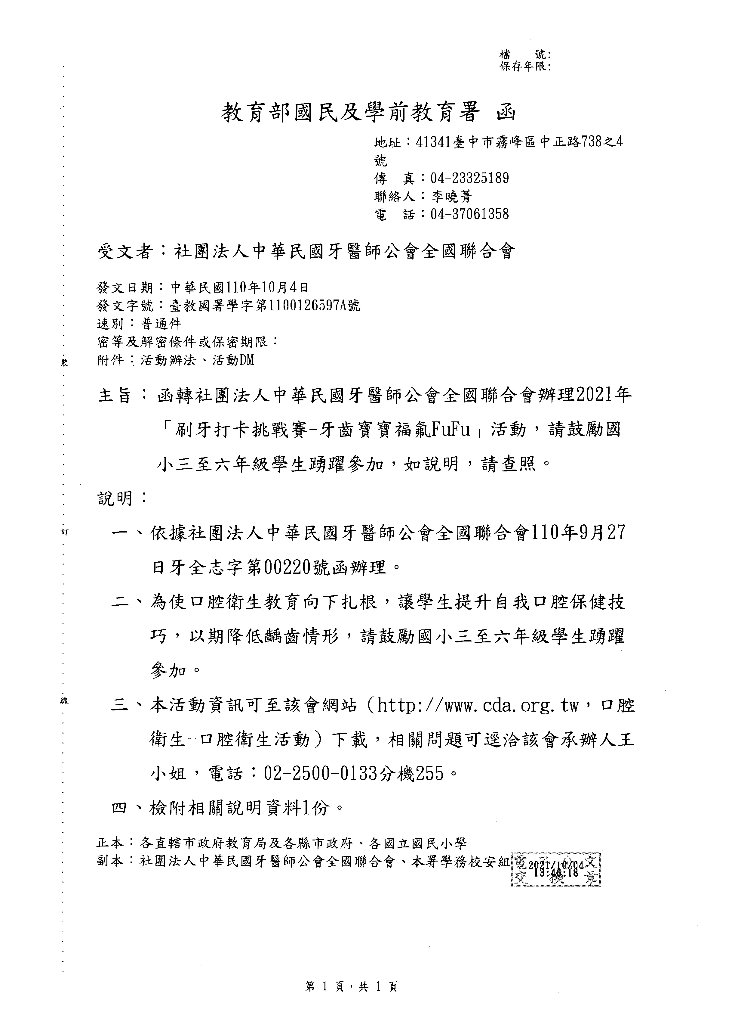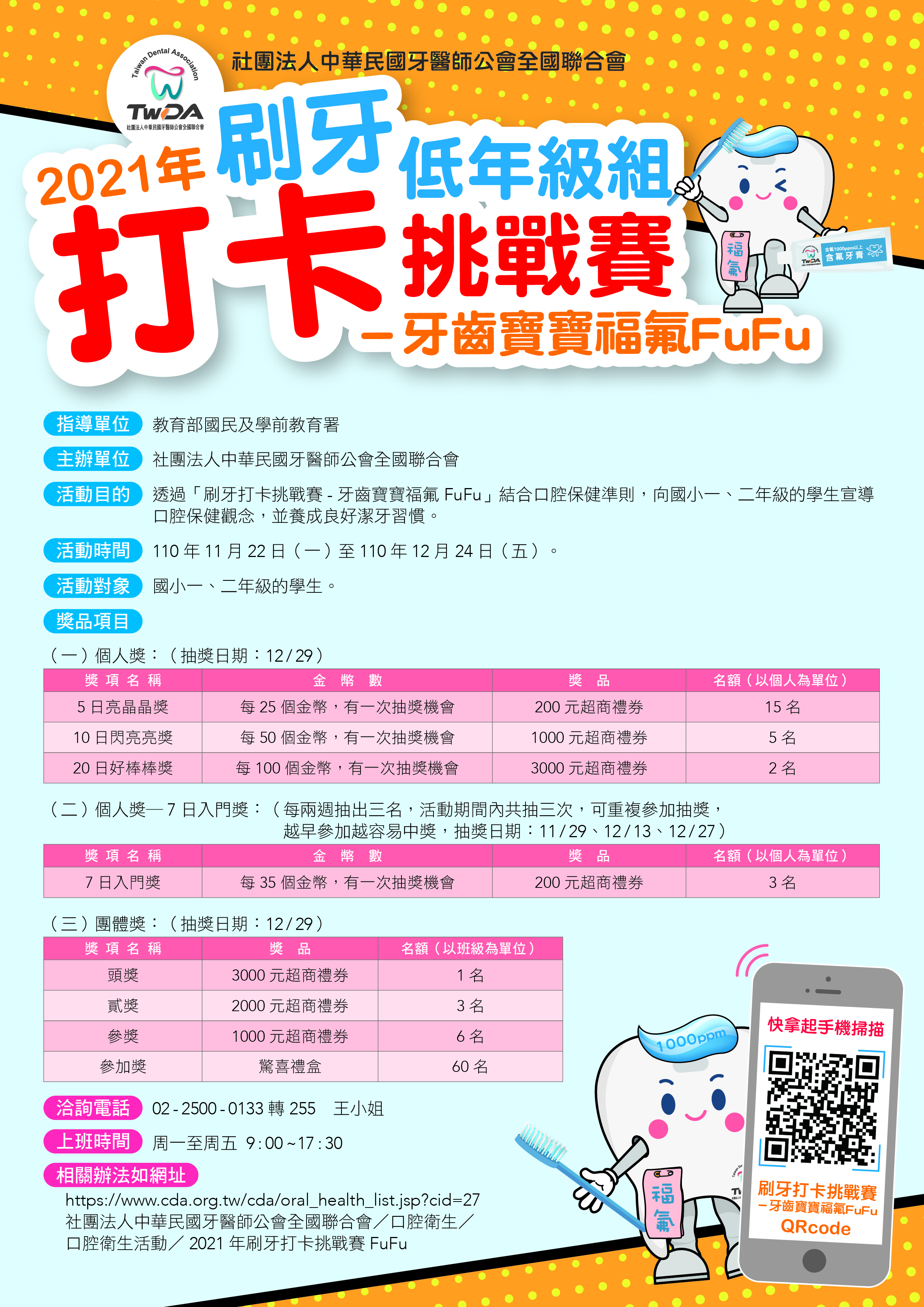獎勵措施:凡參加「刷牙打卡挑戰賽-牙齒寶寶福氟FuF低年級組」之學生將有機會獲得優質好禮,本次獎項有超商禮券、驚喜禮盒,將於本會以公開方式進行抽獎,並將得獎名單公告於本會官方網站[社團法人中華民國牙醫師公會全國聯合會/口腔衛生/口腔衛生活動]。