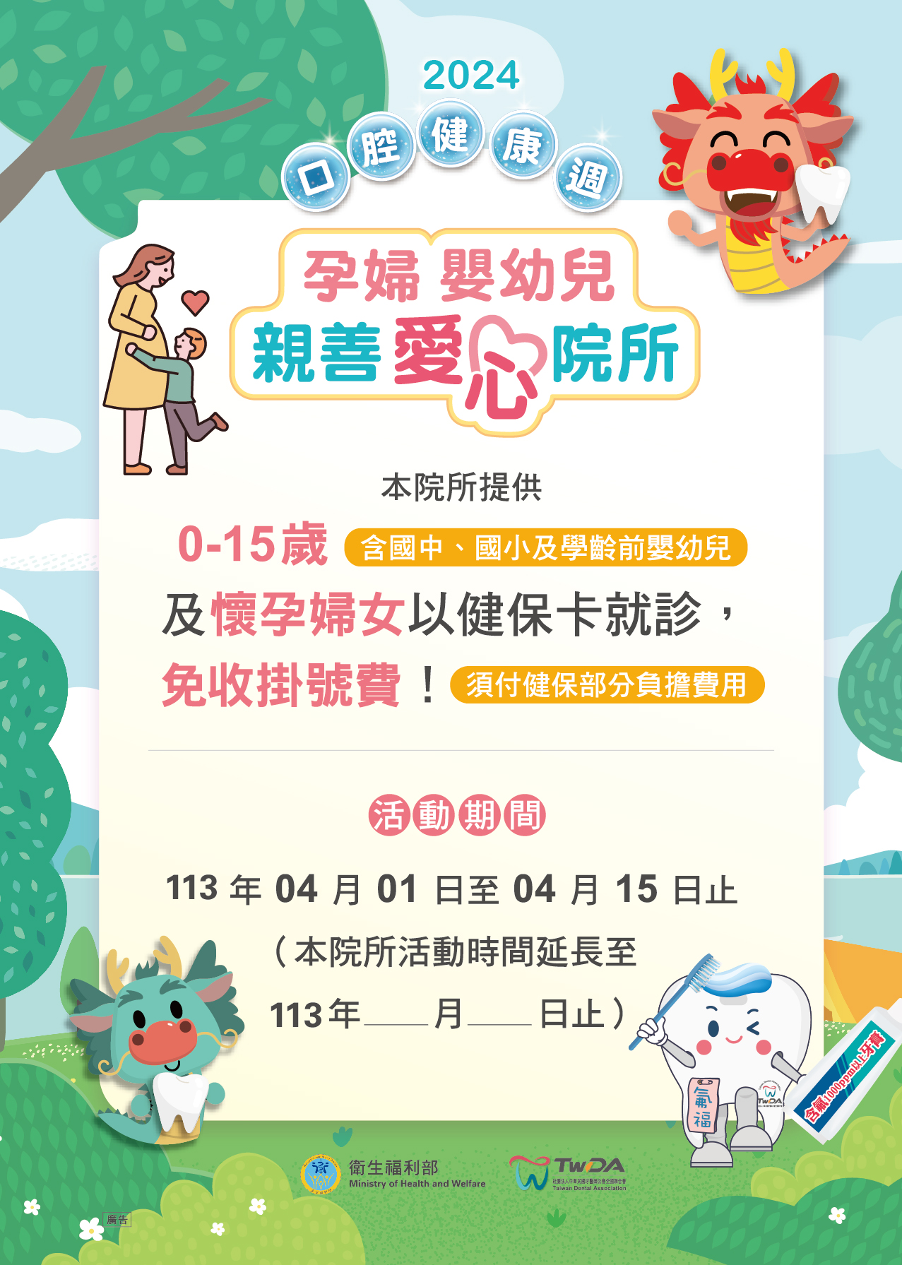 2024年孕婦嬰幼兒親善愛心院所紅布條、關東旗、海報、貼紙檔案下載歡迎參與本活動之牙醫醫療院所下載使用。
