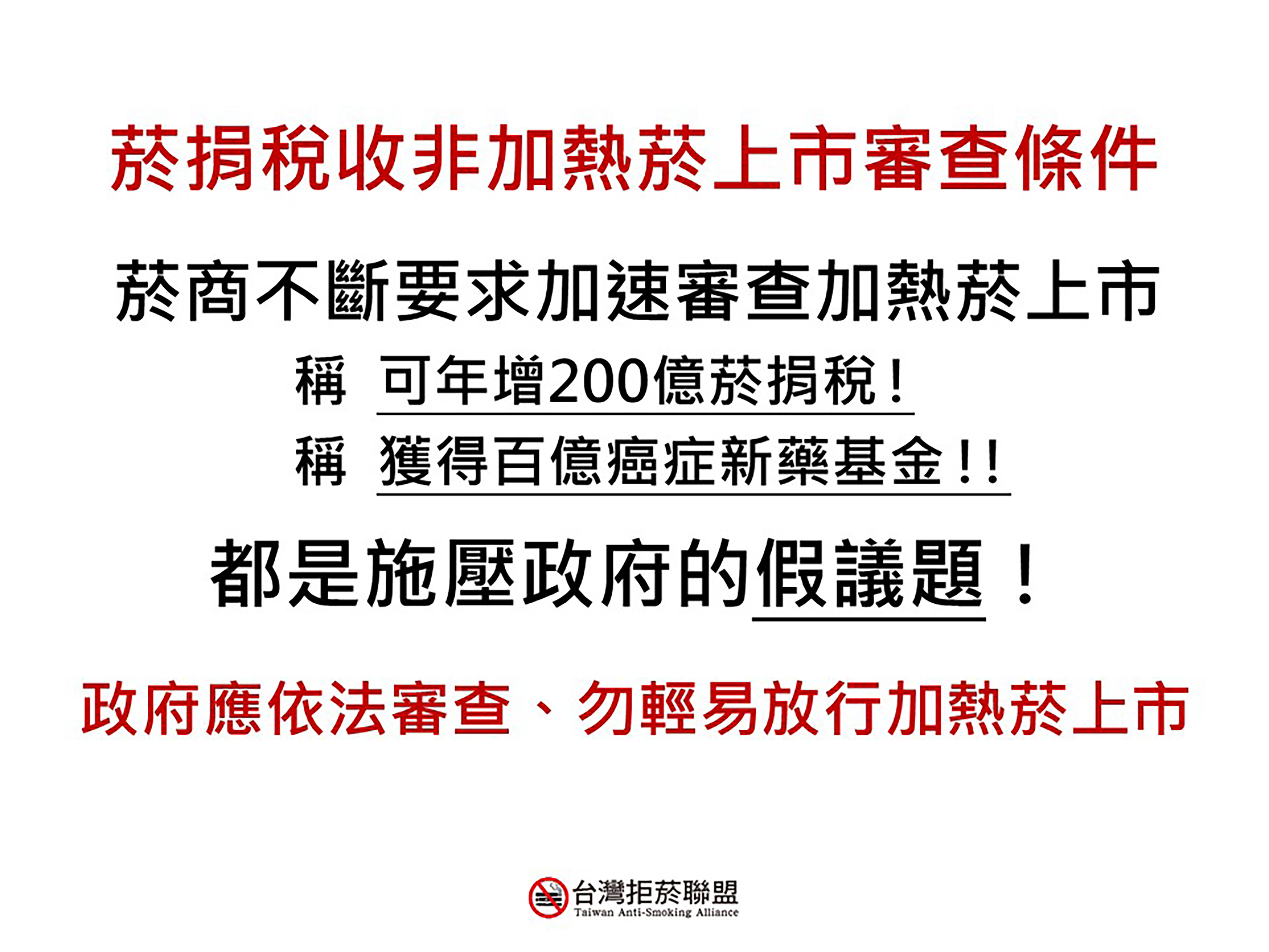 跨國菸草公司在台灣每年的營業額約2000億,現在特定團體打著假議題再花錢請千人上凱道對政府施壓,台灣拒菸聯盟「請這些特定團體饒了我們下一代,不要為了龐大的利益傷害台灣的年輕人;也請衛生福利部與WHO同步、積極宣導加熱菸的危害,勇敢拒絕菸商干擾、出面揭露菸商真面目」。