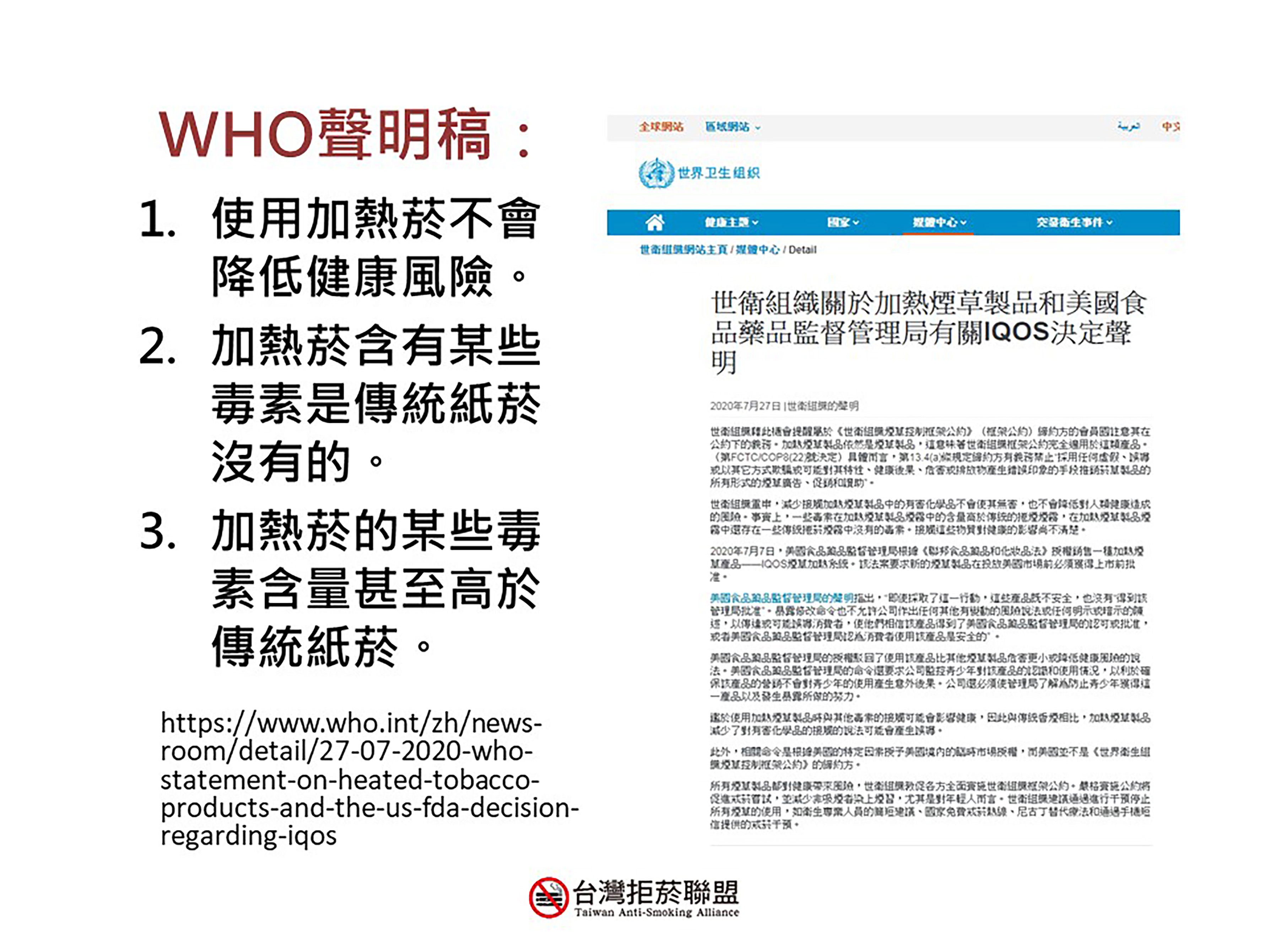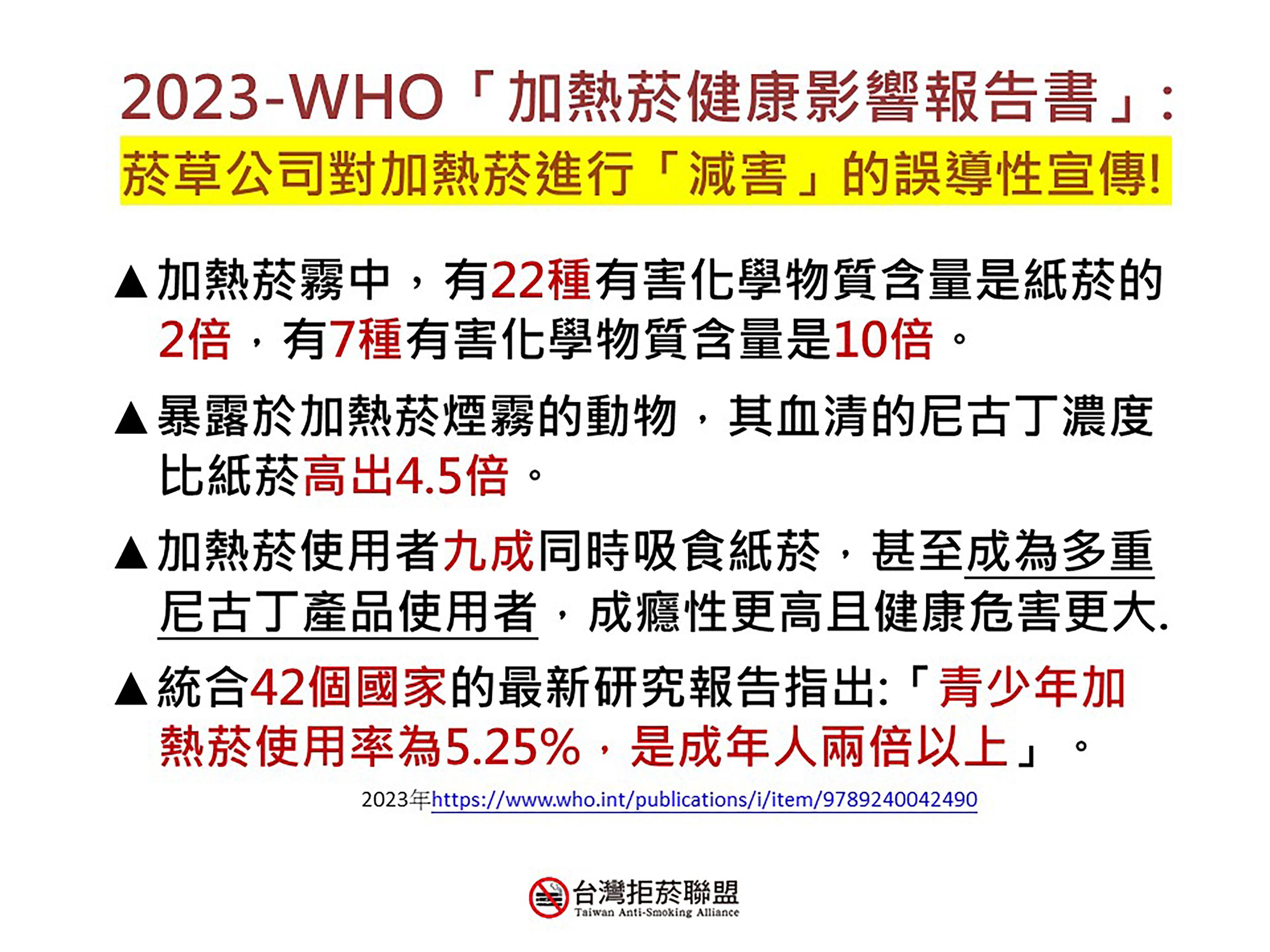 WHO警告:「菸草公司的目標很明確,就是讓年輕一代對尼古丁成癮,而新興菸品(電子煙、加熱菸)就是菸草公司的捷徑」〪台灣菸害防制法明文規定禁止電子煙,加熱菸則須通過上市審查才可販售〪