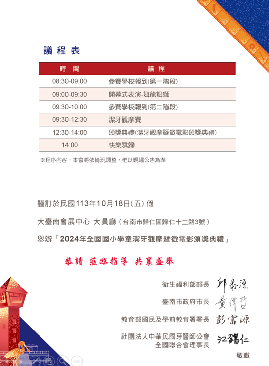 我們誠摯邀請您參加「2024年全國國小學童潔牙觀摩暨潔牙微電影頒獎典禮」。活動中將進行學童潔牙技巧觀摩賽及微電影和四格漫畫的頒獎,您的蒞臨將為活動增添光彩。