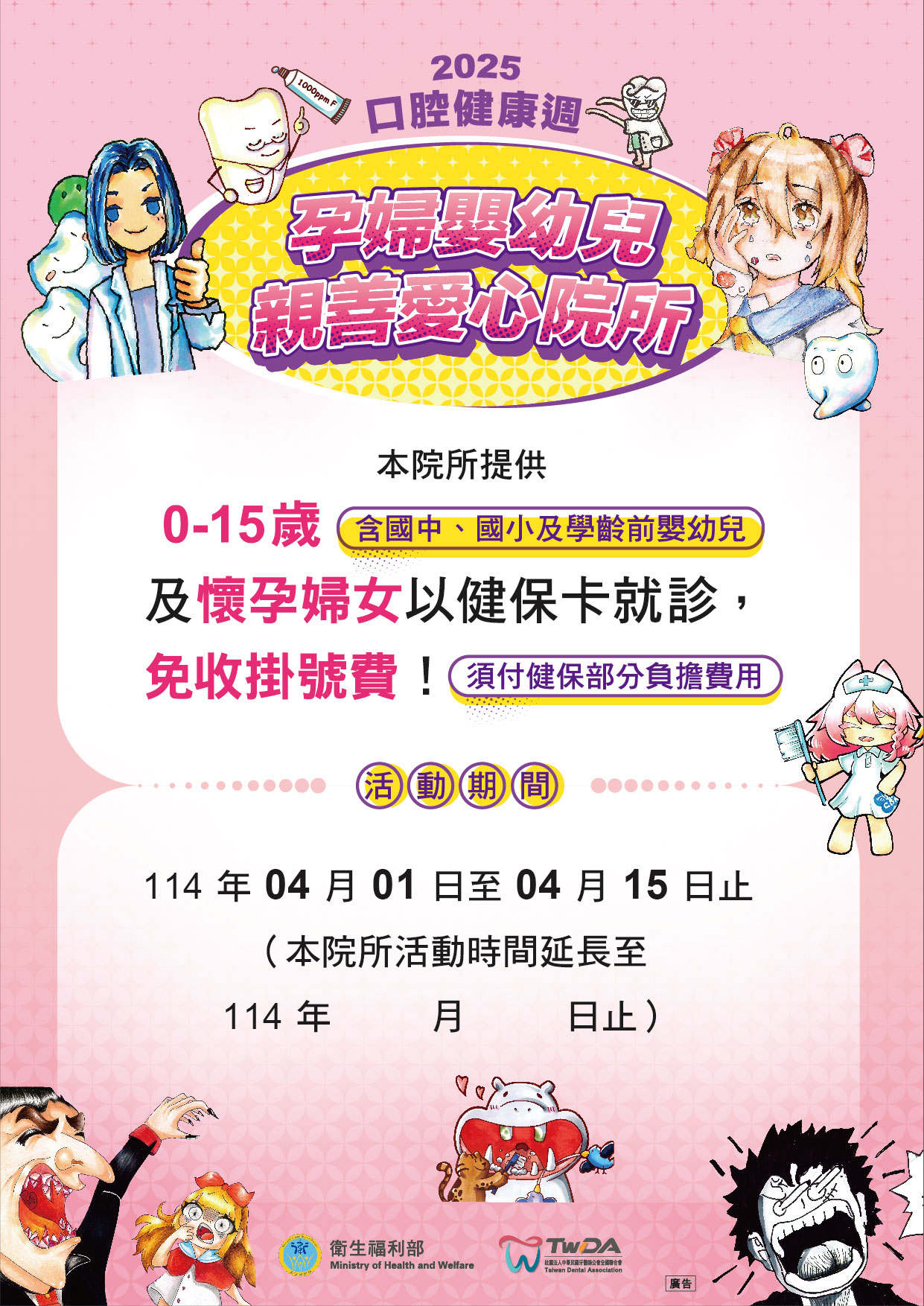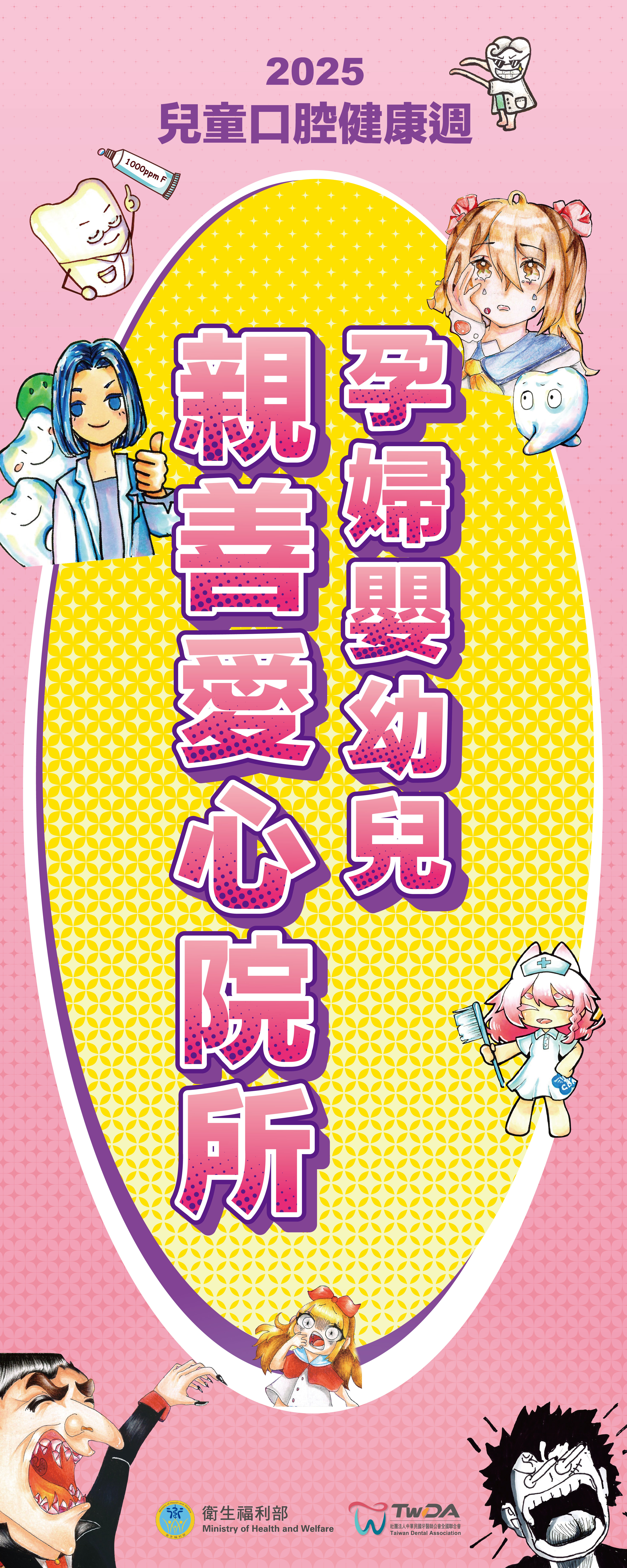 2025年孕婦嬰幼兒親善愛心院所紅布條、關東旗、海報、貼紙檔案下載歡迎參與本活動之牙醫醫療院所下載使用。(院所專區)
